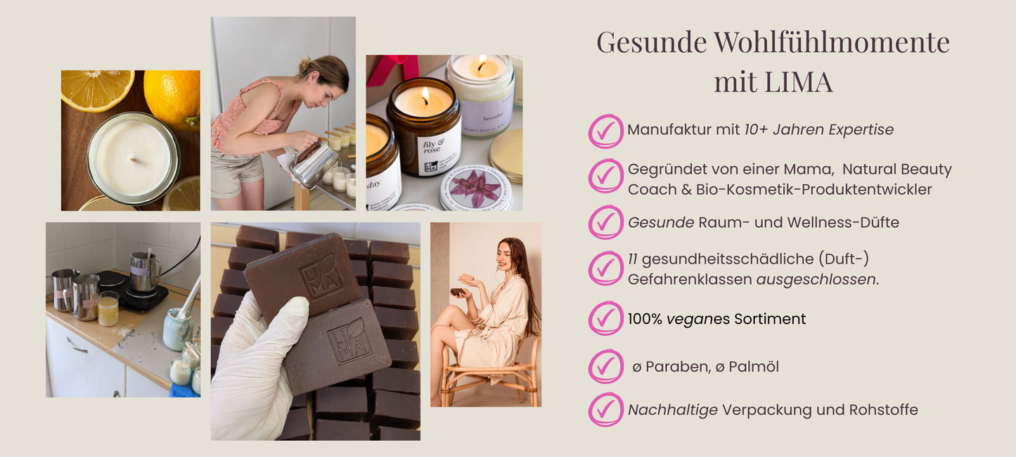 Deshalb entwickle ich jede LIMA-Kerze selbst und prüfe sie streng auf höchste Qualität – mit natürlichen, nachhaltigen Inhaltsstoffen und fein abgestimmten Duftkompositionen. Für eine beruhigende Atmosphäre, in der du loslassen, neue Energie tanken und wertvolle Momente mit deiner Familie genießen kannst.