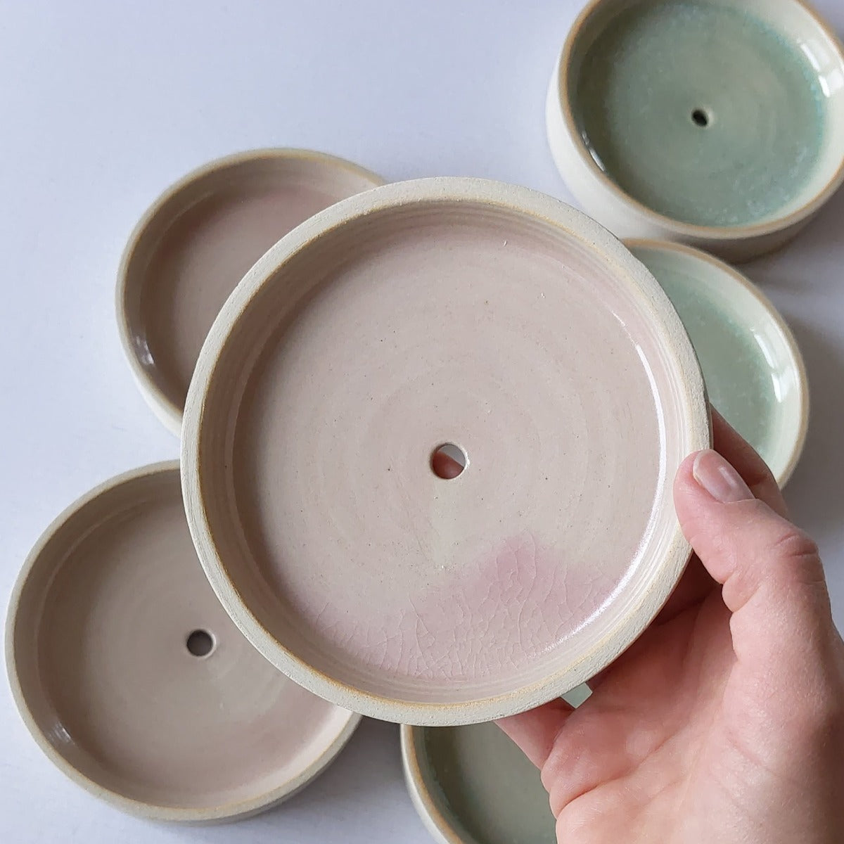 Durch die Handarbeit ist jede Seifenschale ein Unikat. Abweichungen von der hier abgebildeten Seifenschale sind vor allem in der Musterung und der Farbintesität der Glasur möglich.